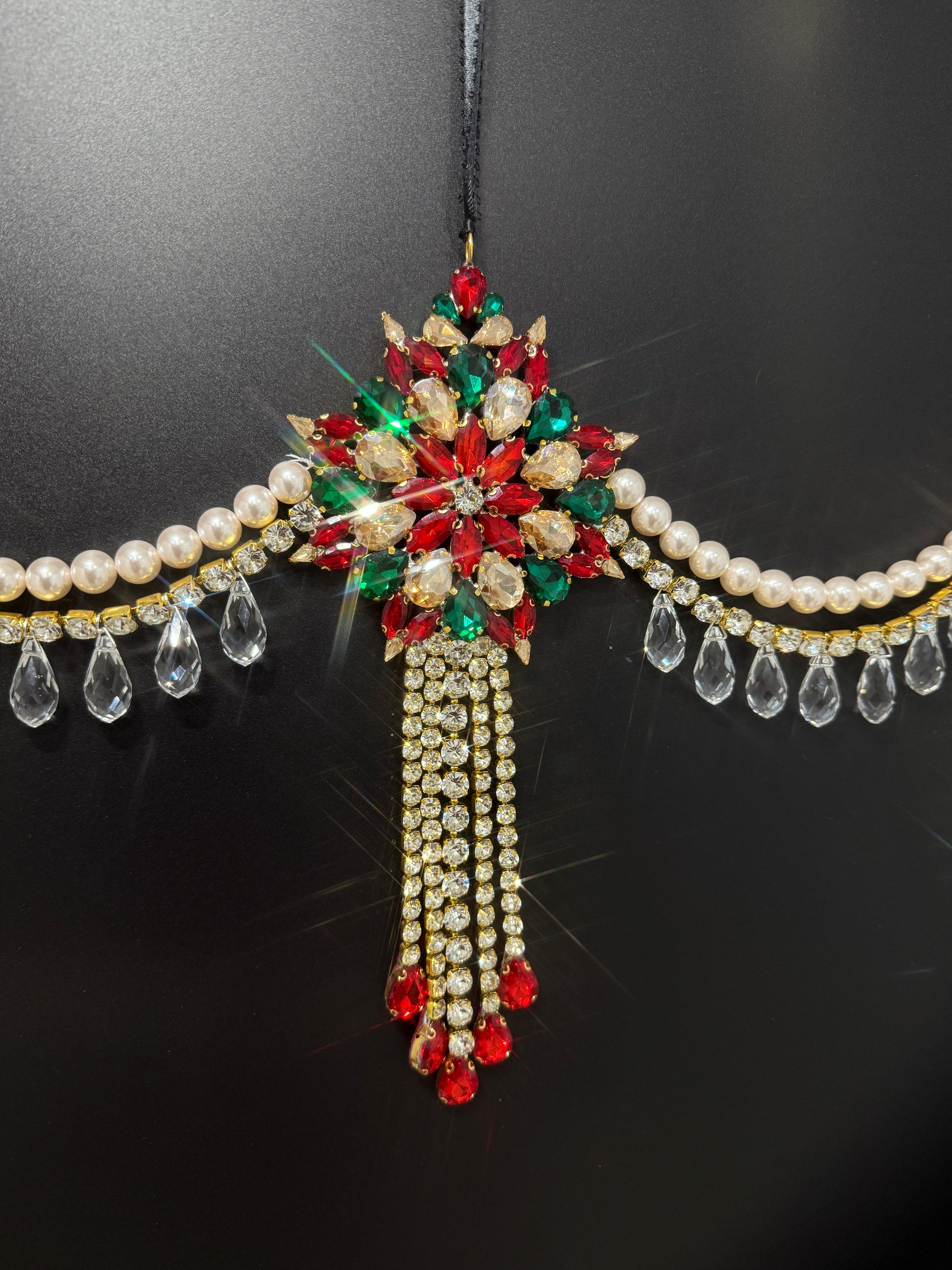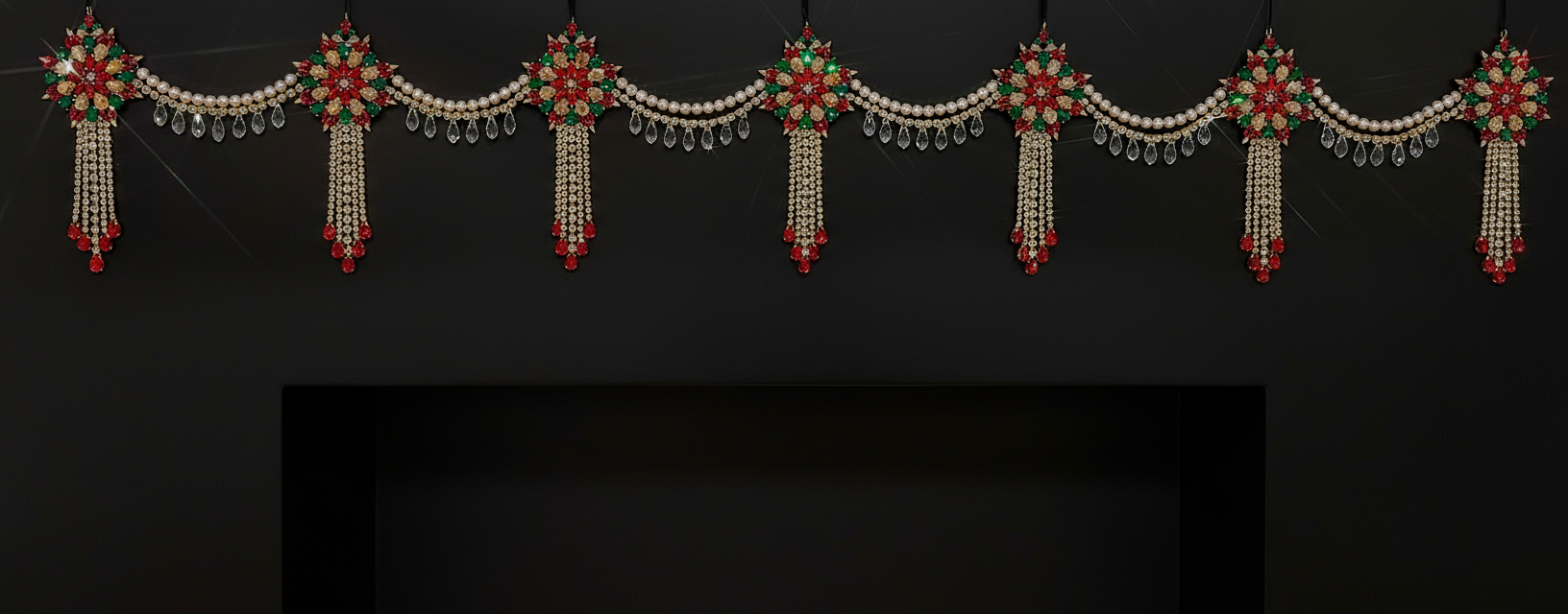 Each piece is made using crystal rhinestones, gold accented teardrop crystals, and high quality glass pearls, adding depth, sparkle, and refined sophistication. The garland is backed with rich red velvet to protect your mantel and complete the elegant look.