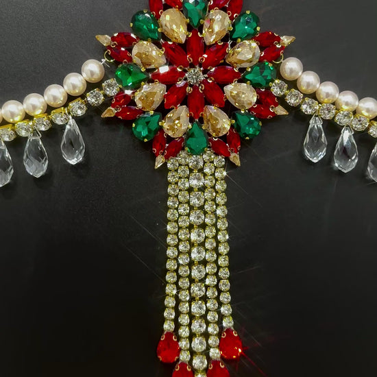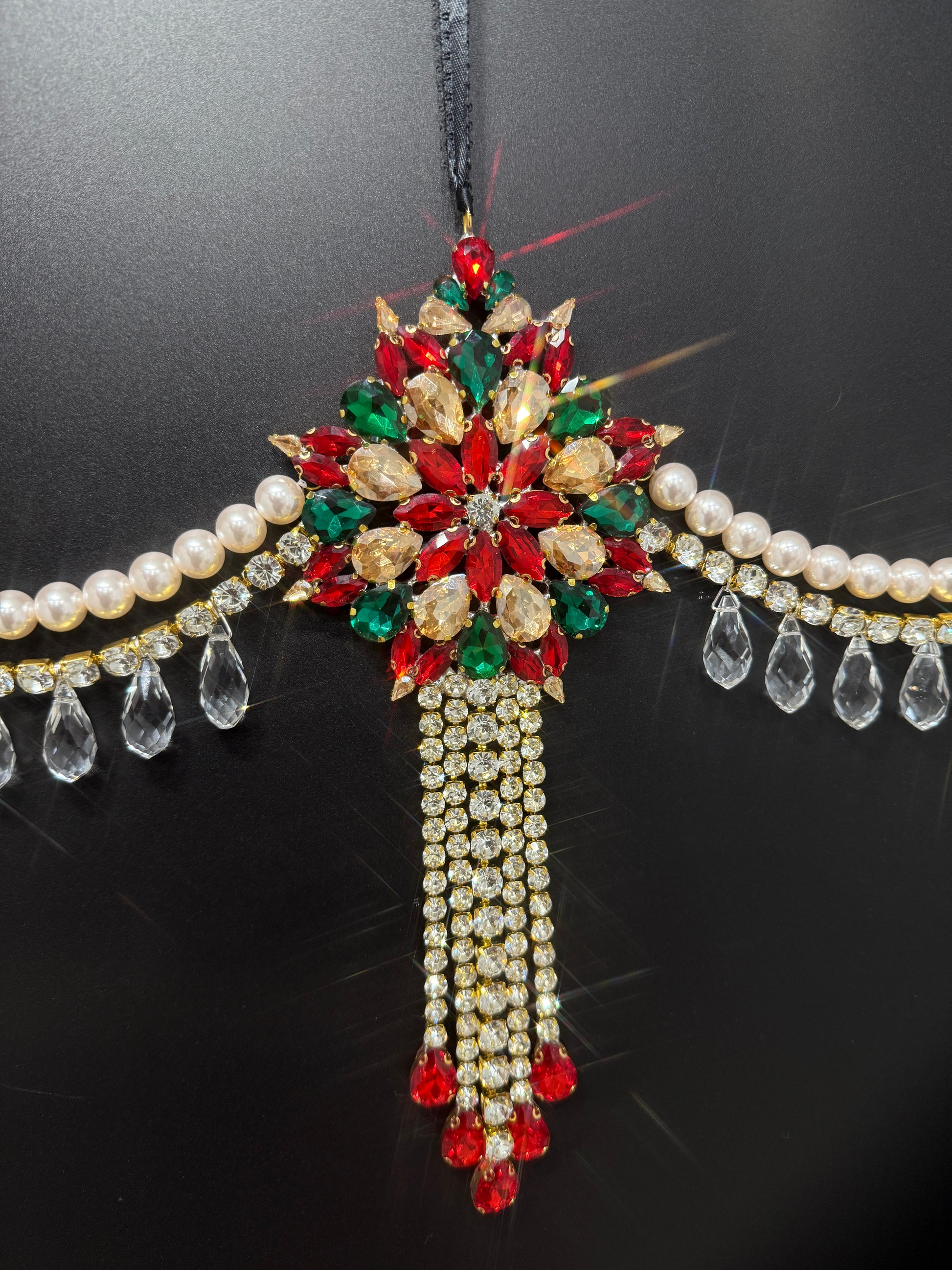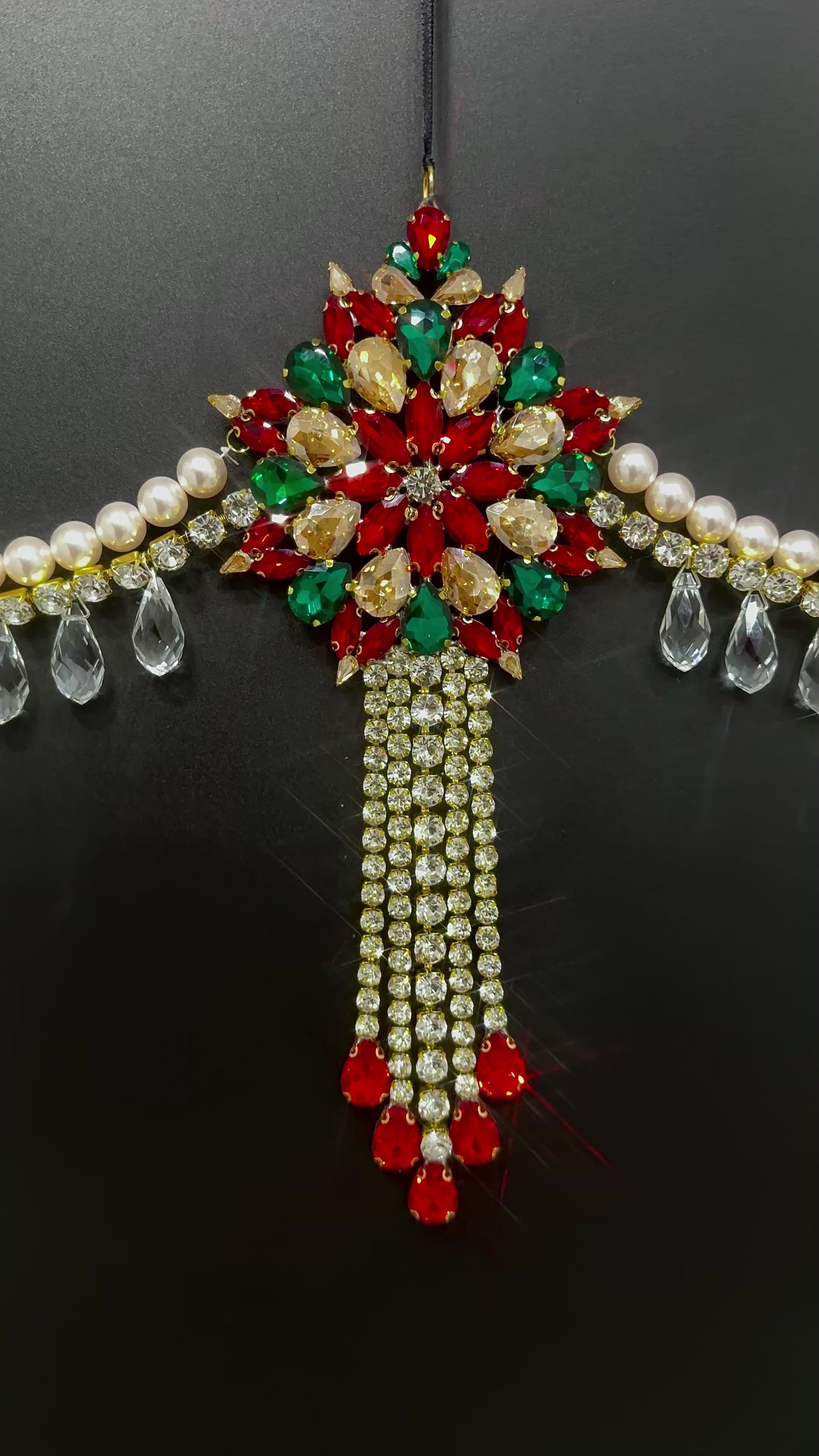 Bring timeless elegance to your holiday mantel with this handmade jeweled Christmas garland, perfectly designed for a 66 inch fireplace mantel. This masterpiece features seven handcrafted medallions with a cascading design adorned in red crystal teardrops, creating a luxurious flow of light and movement across your mantel.